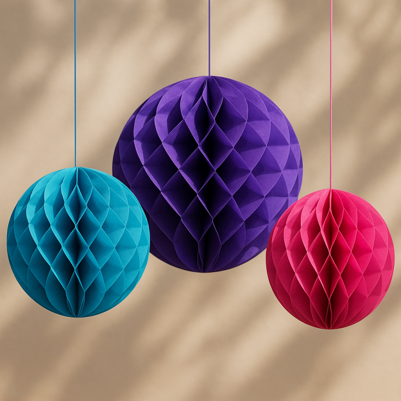 Комплект от 3 броя висящи парти декорации във формата на топка, изработени от хартия в цвят тюркоаз, лилаво и цикламено.