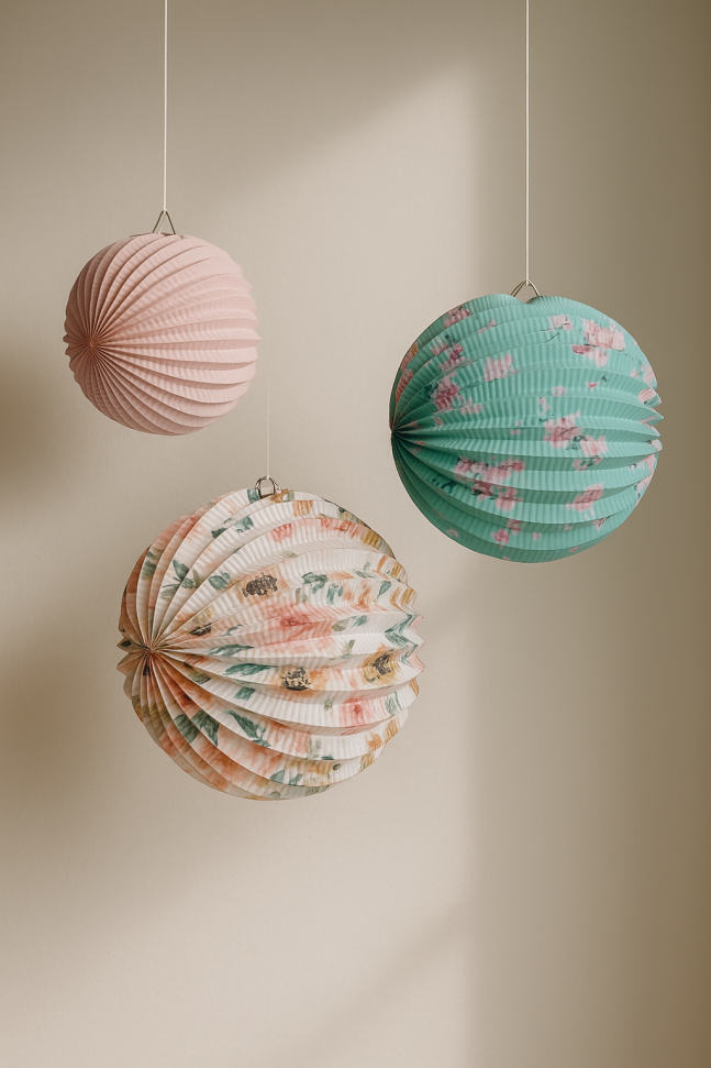 Комплект от 3 броя висящи парти декорации във формата на топка, изработени от хартия в пастелни цветове с красив флорален принт и телена рамка, за да стоят отворени.