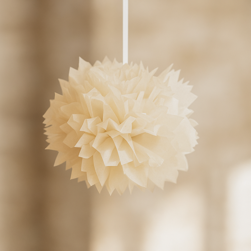 Висяща парти декорация във формата на помпон, изработена от хартия в цвят екрю.