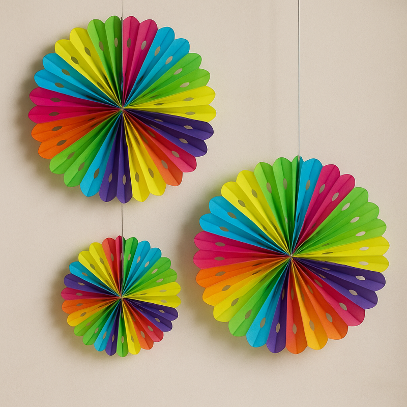 Комплект от 3 броя висящи парти декорации във формата на ветрило с различни размери, изработени от хартия в цветовете на дъгата.