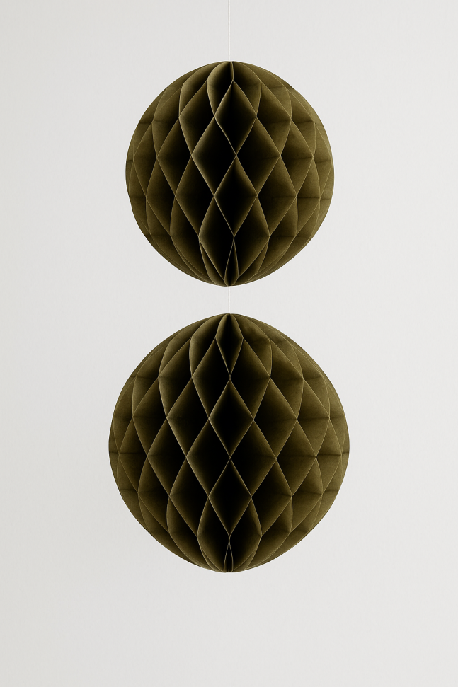 Комплект от 2 броя висящи парти декорации във формата на топка, изработени от хартия в цвят старо злато.