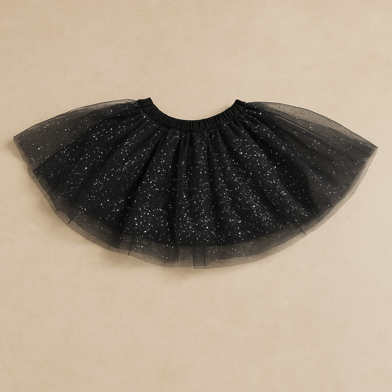 Карнавална поличка за момиче, изработена от полиестер в черен цвят с подплата и блестящи брокатени частици.