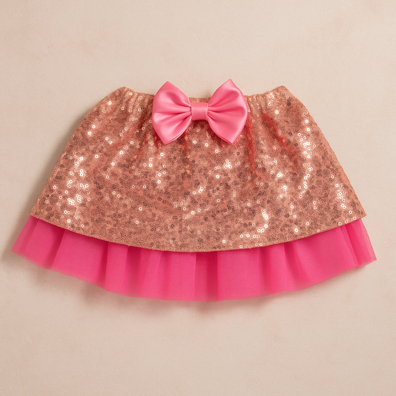 Карнавална поличка за момиче, изработена от полиестер в розов цвят със златисти пайети и розова панделка.