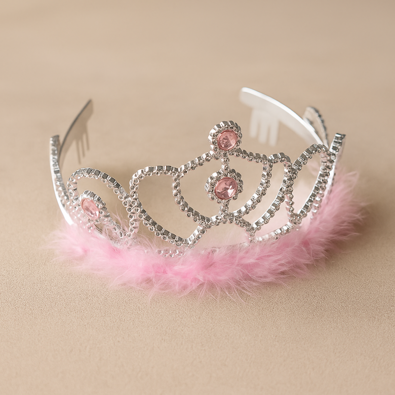 Карнавална корона в сребрист цвят с изкуствени кристали и пера в розови нюанси.