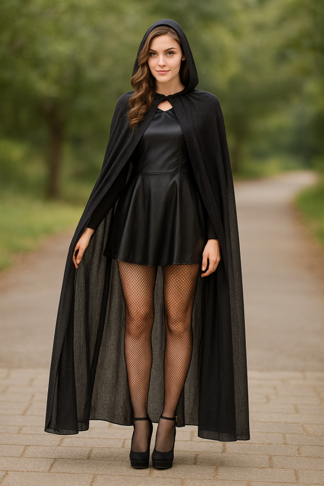 Дамска карнавална пелерина, изработена от прозрачна материя в черен цвят със сребристи частици, качулка и възможност за завързване на шията.