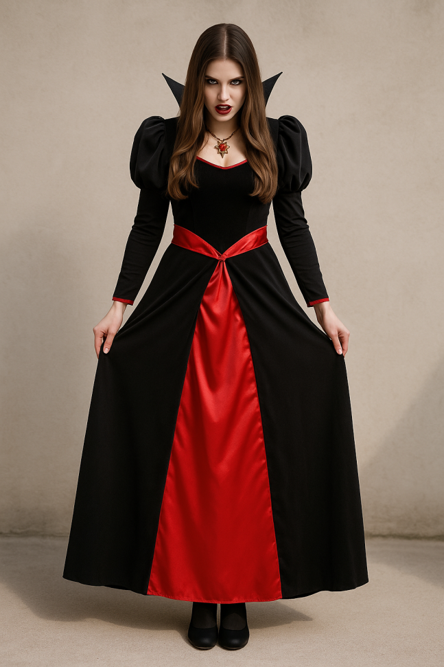 Атрактивен костюм на вампир, включващ дълга рокля с висока яка и тематична огърлица.