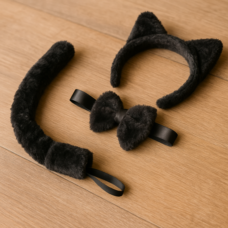 Ефектен комплект, включващ аксесоар за глава с ушички, пухена папийонка и котешка опашка.