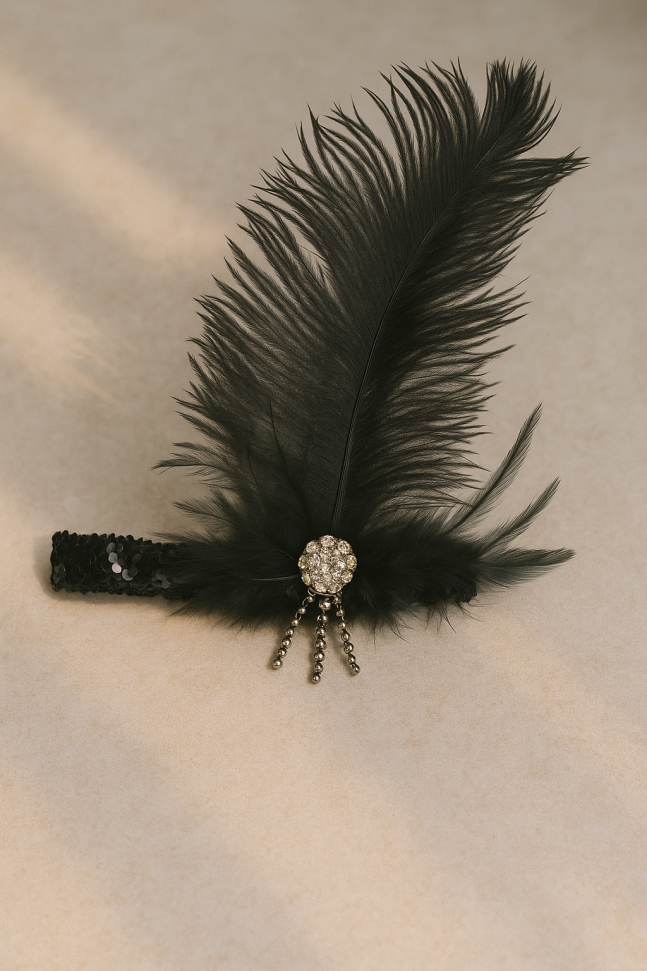 Карнавален аксесоар - лента за глава с черни пайети и голямо перо отпред.