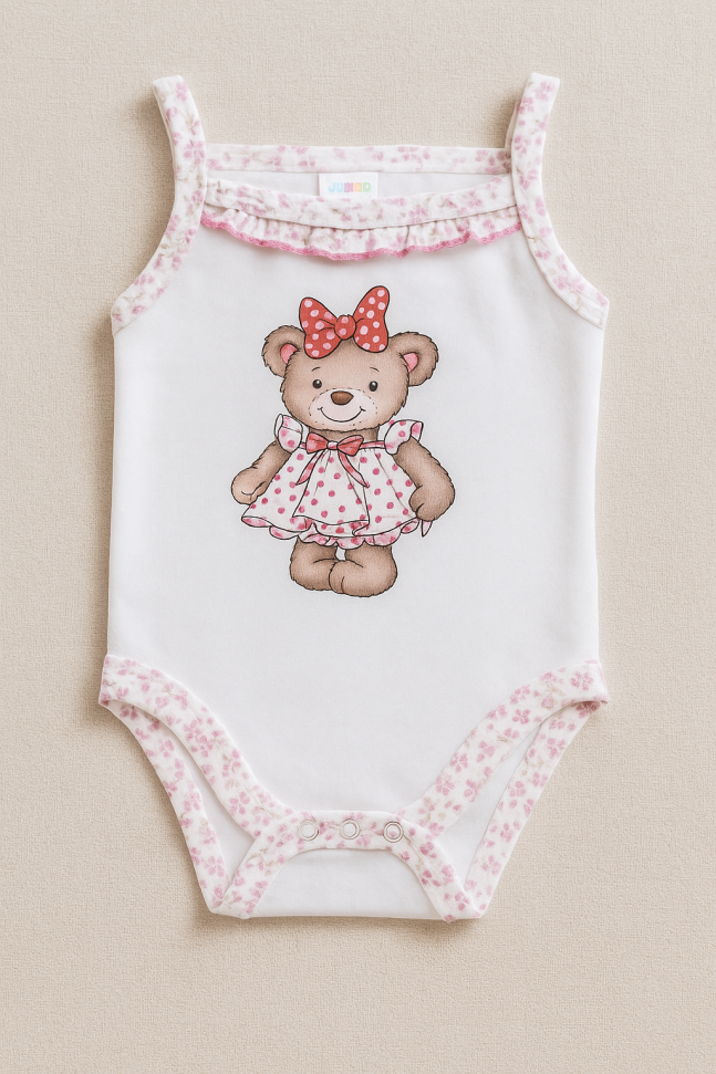 Бебешко боди без ръкави, изработено от мека памучна материя в бял цвят с флорален принт и цветна щампа на мече с рокличка.
