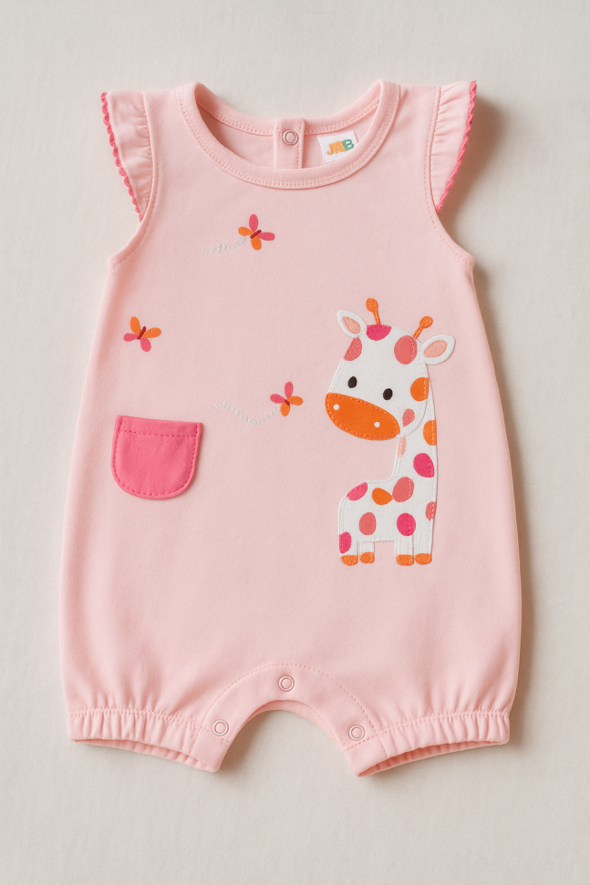 Бебешко боди без ръкав, изработено от мека памучна материя в розов цвят с апликация на симпатично жирафче.
