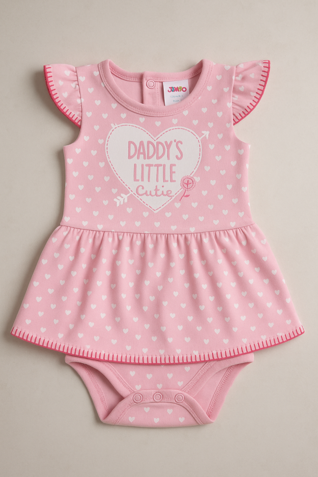 Бебешко боди-рокличка, изработено от мека памучна материя в розов цвят с принт на сърца и голяма щампа на сърце с надпис отпред.