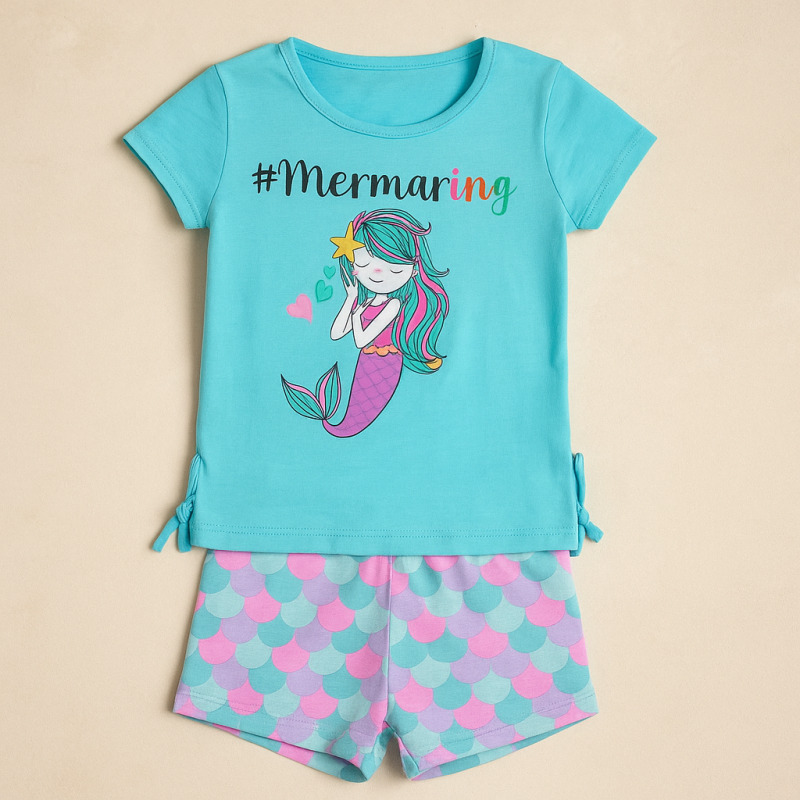 Бебешки комплект, включващ тениска в тюркоазено синьо с щампа на русалка и къс панталон с принт, наподобяващ люспи на риба.