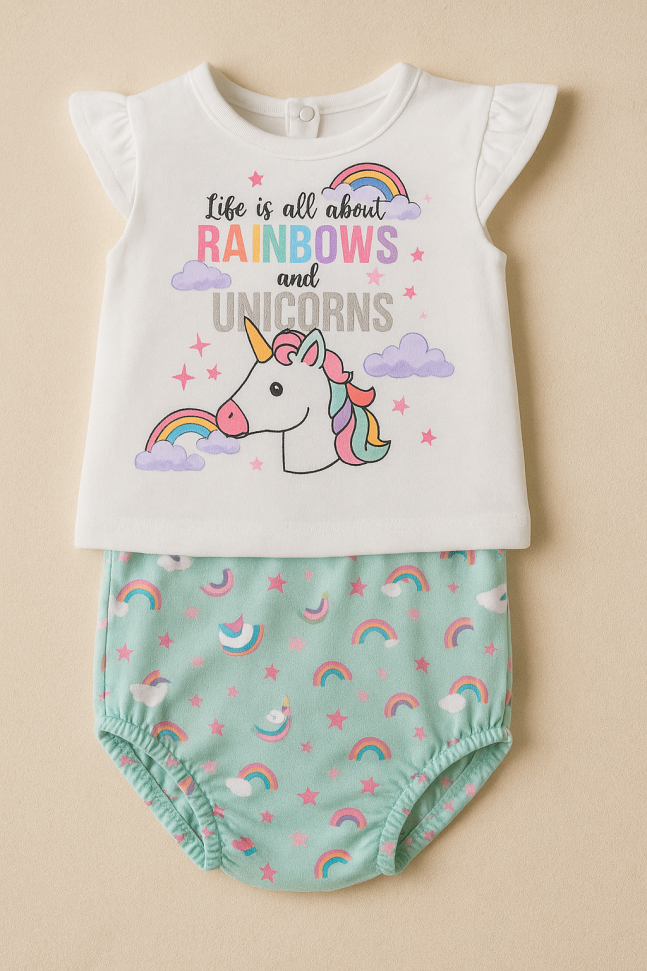Бебешки комплект, включващ тениска без ръкави в резедав цвят с щампа на еднорог и гащички с принт на дъга и сърца.