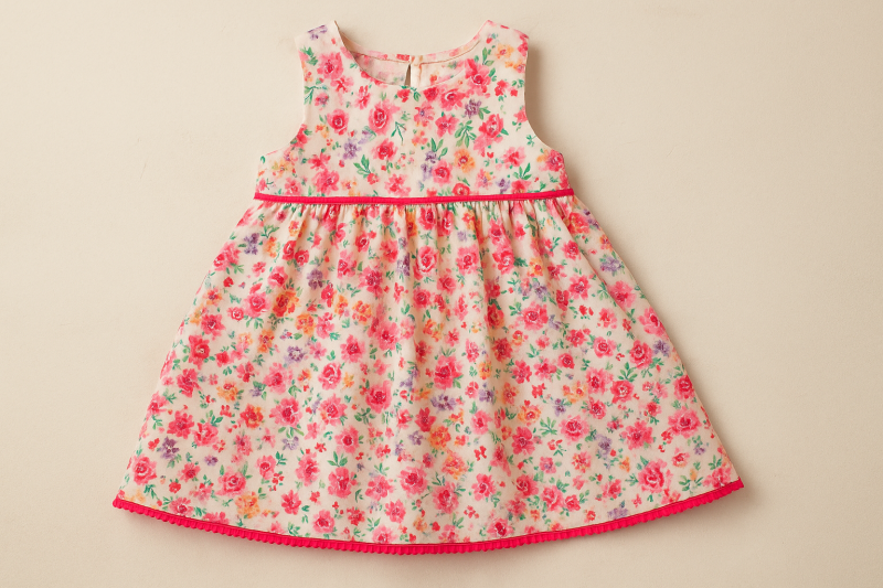 Бебешка рокличка, изработено от мека памучна материя в бледо розов с многоцветен флорален принт.