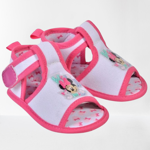 Бебешки сандали, изработени от мека памучна материя в бял цвят с розови кантове и релефна апликация на Мини Маус.