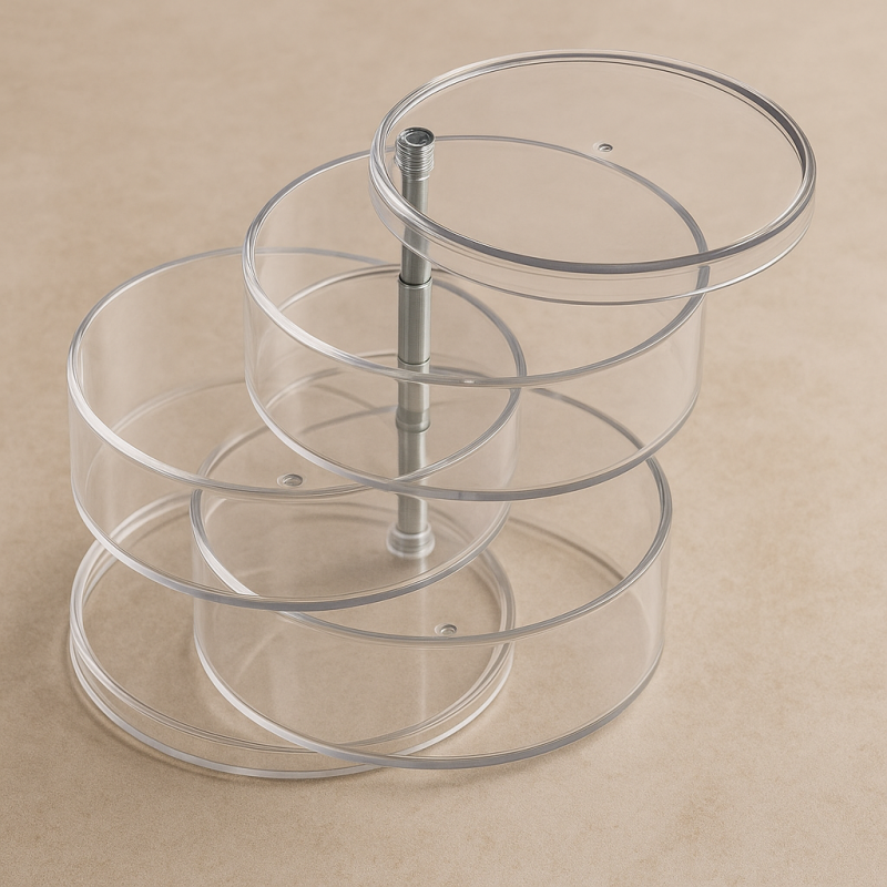 Органайзера за бижута има изграден въртящ се механизъм, с помощта на който много по – лесно и удобно можете да намерите търсения предмет, а външността му е изключително приятен и симпатичен. Органайзера притежава три помещения за съхранение в прозрачен цвят с приблизителни размери 11,5х14 см. Продукта е изработен от акрил, което му допринася допълнителна здравина и устойчивост против надрасквания, което го прави удобен за ежедневна експлоатация.