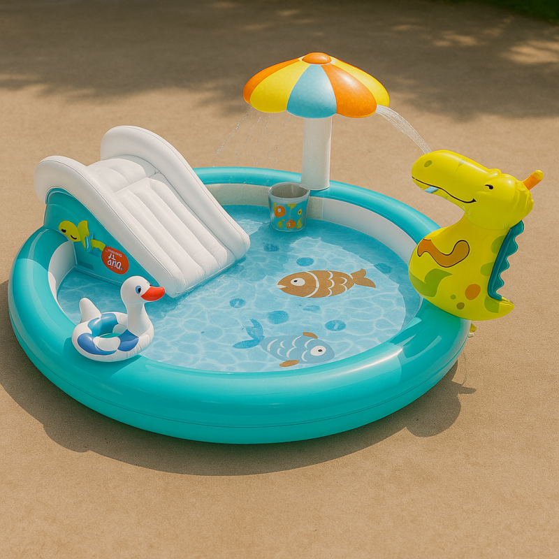 Представяме Ви един голям и необикновен детски плувен басейн, който има изградена пързалка и фонтан под формата на крокодил за пръскане на вода. Басейна има вграден пулверизатор, прикрепен към градинския маркуч, удобна запушалка за източване и красиви картини. В пакета се съдържа и лепенка за залепяне ако е наложително.