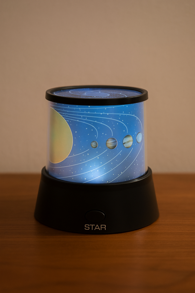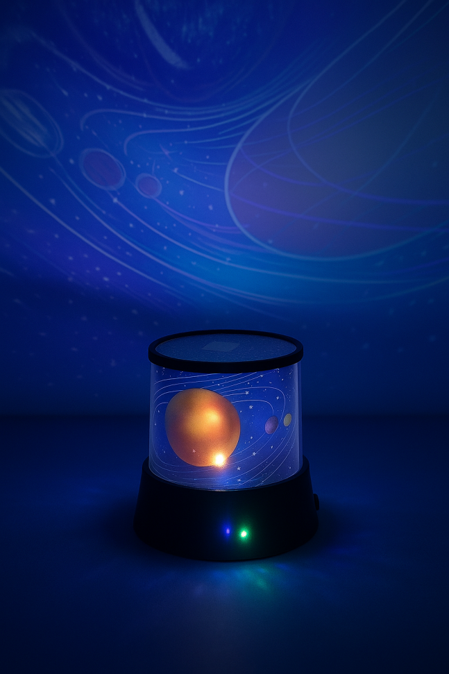 Протектора изобразява слънчевата система и има три функции: въртяща се проекция с бяла светлина, фиксирана проекция с цветна светлина и въртяща се проекция с бяла и цветна светлина. Протектора работи с 3 AA батерии, който не са включени в комплекта, но може да се намерят бързо и удобно в търговската мрежа. Приблизителните размери на проектора са дължина х ширина 11 х 12 см., а материала на изработка е пластмаса.