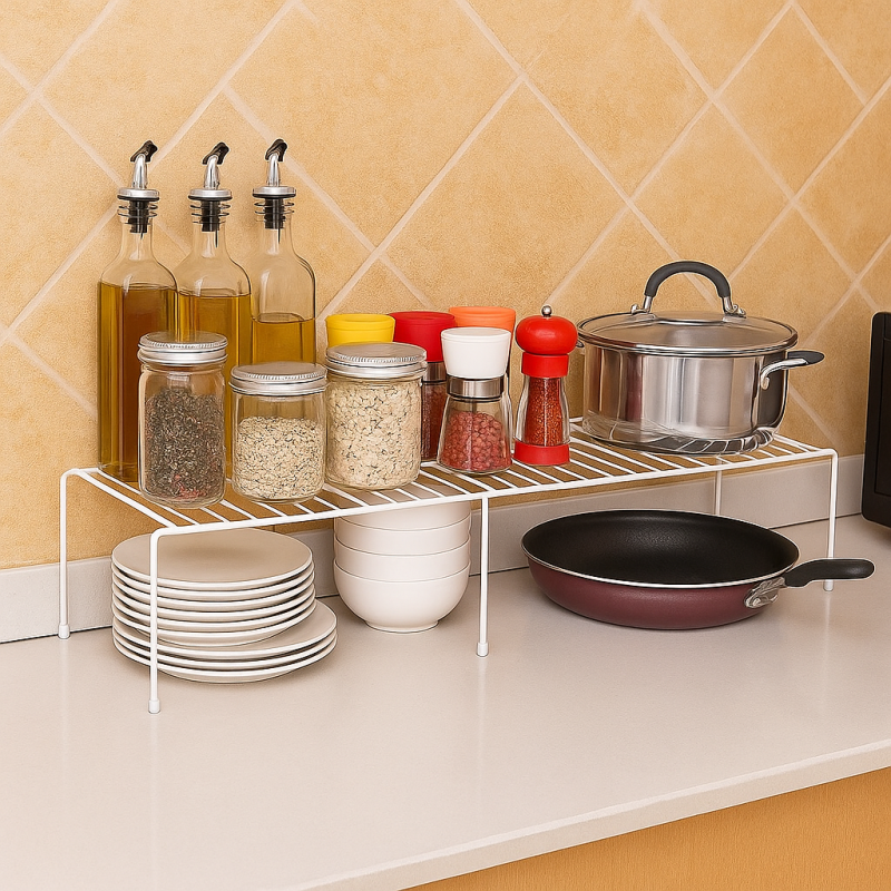 Представяме Ви един разгъващ се рафт, които със сигурност ще е от голяма полза и ще се използва ежедневно за организацията на продуктите в кухненското Ви пространство.