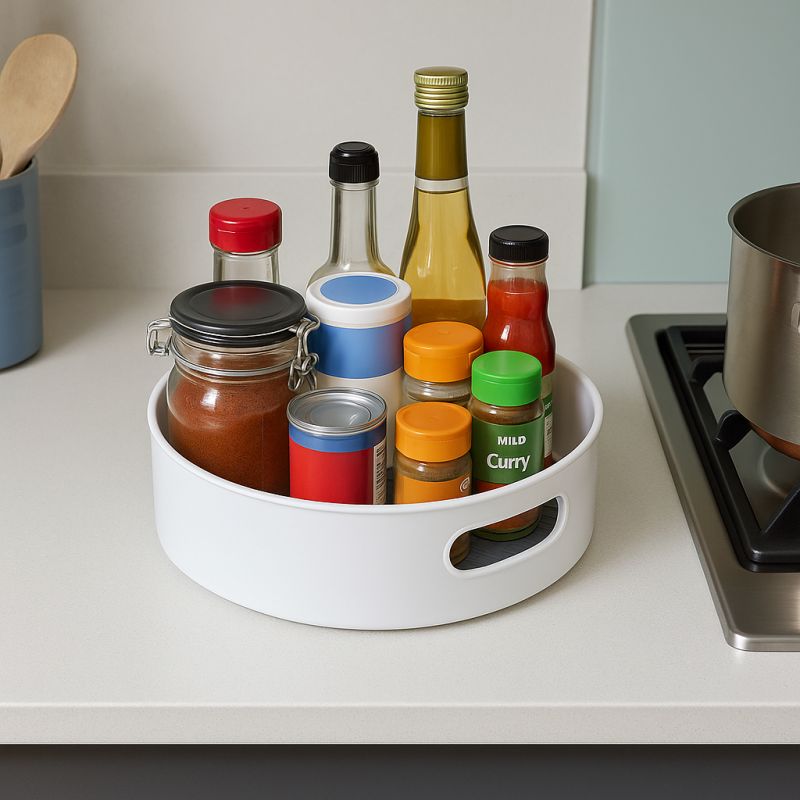 Въртящия се кухненски поднос е подходящ за подреждане на малки бурканчета за подправки, сладки, солници и т.н. Може да се завърта на 360º, което помага да намерите и вземете точно това, което ви трябва само с едно лесно завъртане. С него спестявате пространство и достигате лесно и бързо до това, което търсите.