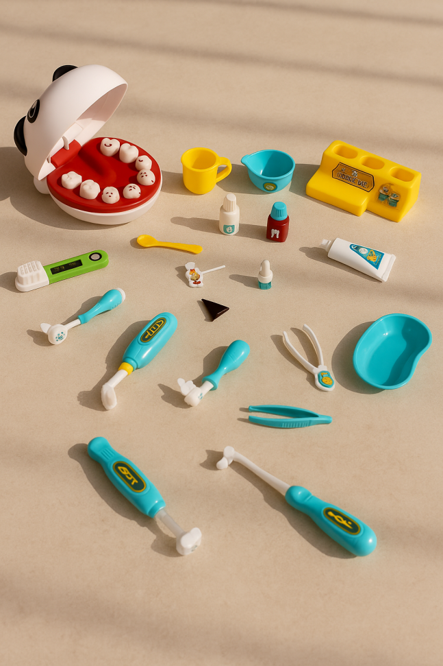 Комплекта е подходящ за деца над 3 години независимо дали са момчета или момичета, като ще им помогне да доразвият своите интелектуални умения и да формират своят лекарски характер. Комплекта ще осигури на ветеринарният лекар - зъболекар възможност да се отстраняват повредените зъби на кучето, да проверява устната му хигиена и измива зъбите му със специалната паста за животни. Стоматологичното огледало има светлина, а ваденето на зъб има звук. Комплекта работи с 2 батерии тип AG10, които са включени в комплекта за малчуганите за първоначална употреба.