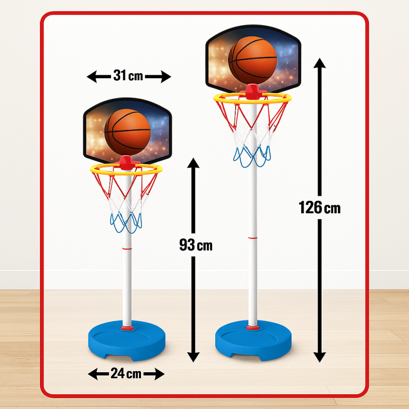 Максималната височина на баскетболния кош е 126 см. без таблото. За по голямо удобство на бъдещите потребители в комплекта е включена топка за игра 12 см. Дизайна на баскетболния кош позволява бързо и лесно сглобяване. Баскетболния комплект включва 25 см. пластмасова основа, която можете да напълните с вода, но ако решите да я напълните с пясък е по добрия вариант., за да я стабилизирате и 3 х 24 см. тръби, които имат възможност да се свързват заедно, за да направят коша толкова висок, колкото Ви е необходим. Таблото е с приблизителни размери 43 x 33 см и ръб 25 см.