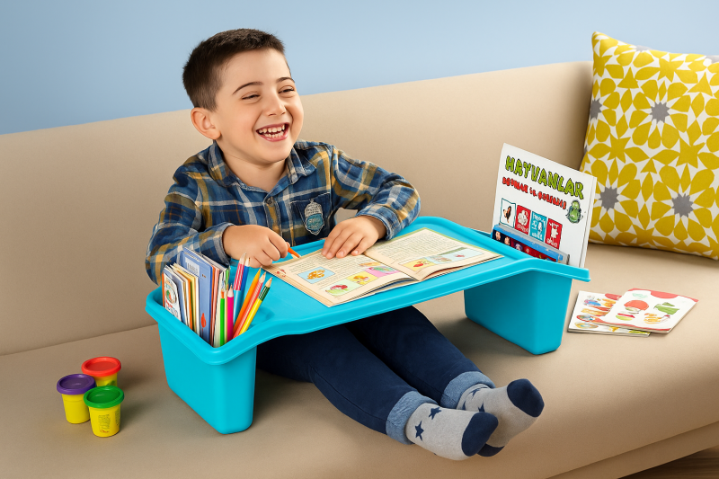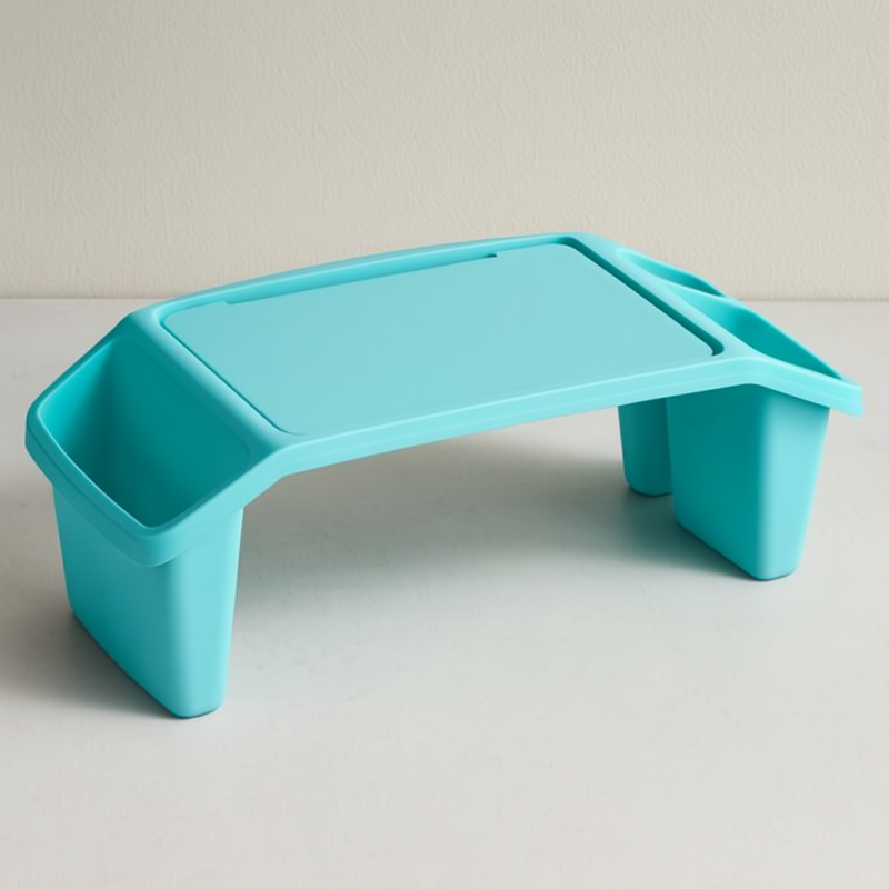 Олекотения дизайн на бюрото позволява на детето да може да го вдигне от крака без чужда помощ, като може да се използва, когато детето седи в леглото, на дивана или на пода и общо взето навсякъде и по всяко време когато му бъде необходимо. Бюрото е изработено от пластмаса, като има изключително лек и преносим дизайн, който позволява лесното му съхранение и използване от децата. Бюрото има голяма повърхност от 35 х27 см., върху която детето може да пише, рисува, чете, хапва и какво ли още не. Отстрани има джобове с приблизителни размери 24 х 9 х 17 см, 15,5 х 9 х 27 см. за най - различни аксесоари, като моливи, химикали, играчки и джоб за чаша или бутилка с диаметър 8 см.