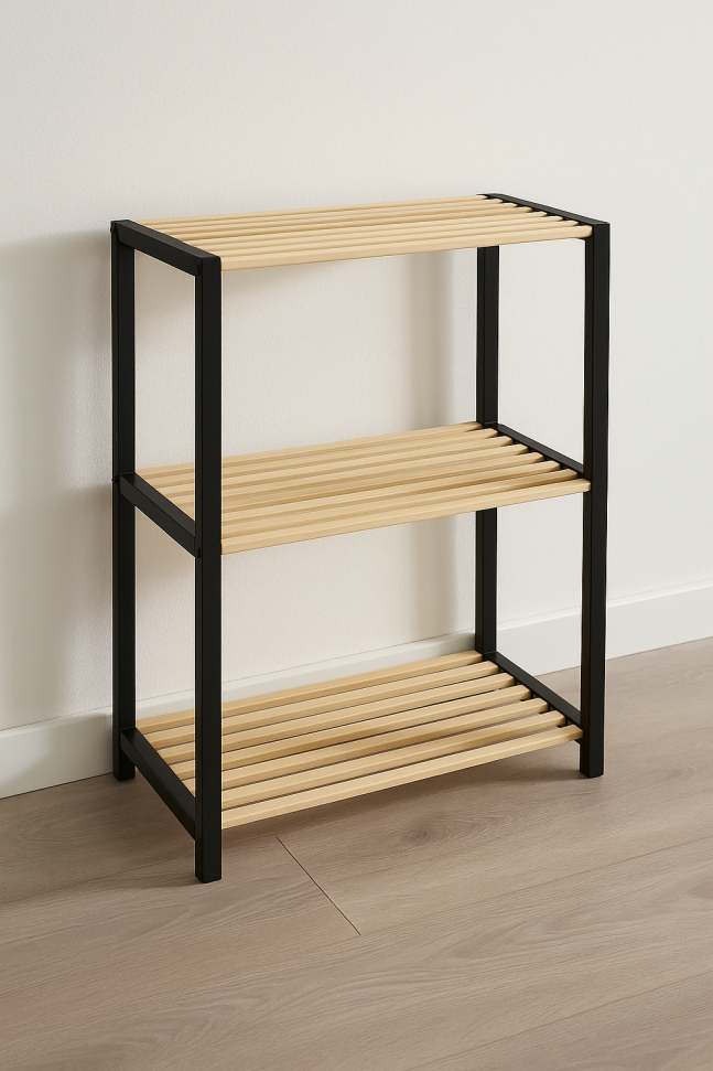 Обогатете вашето пространство с елегантната и функционална подова етажерка от масивно дърво, представена с този стилен дизайн. Съчетавайки черната рамка с естествените дървени рафтове, този рафт е идеален акцент за всяка стая в дома ви или офиса.