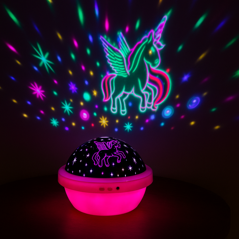 Проекторът за момичета с LED осветление във формата на еднорог представлява забавна и вълнуваща добавка към всяка стая.