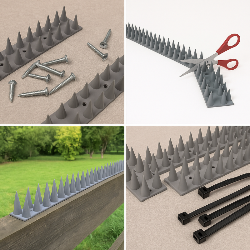 Еднo от най-големите предимства на тези шипове е лесният монтаж. Всеки прът е снабден с няколко отвора, които позволяват закрепване с винтове, пирони, лепило или кабелни връзки. Това прави шиповете подходящи за различни видове повърхности, включително както равни, така и извити. Гъвкавият материал позволява лесно адаптиране към извити части, като например первази, огради или покриви.