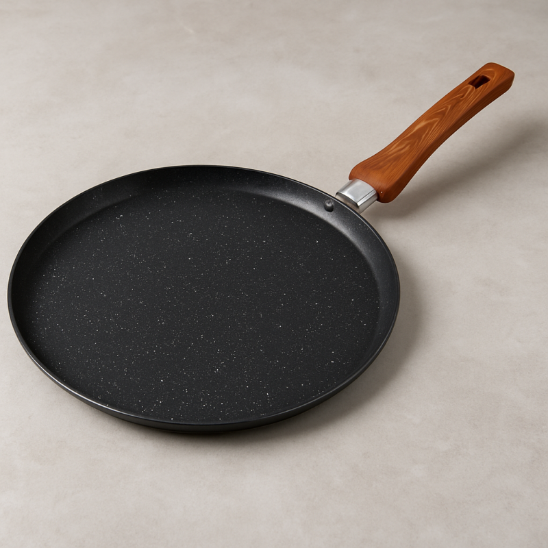 Тиган за палачинки или омлет - 26 см с незалепващо покритие и пластмасова дръжка с дървесен ефект. Подходящ за газови, халогенни, електрически и керамични котлони.