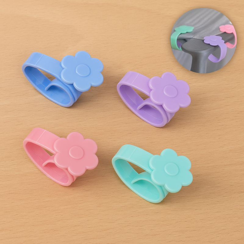 Щипки за покривка на маса - цветни, ветроустойчиви пластмасови щипки в 4 цвята (син, лилав, мента и розов) с шарка на цветя.