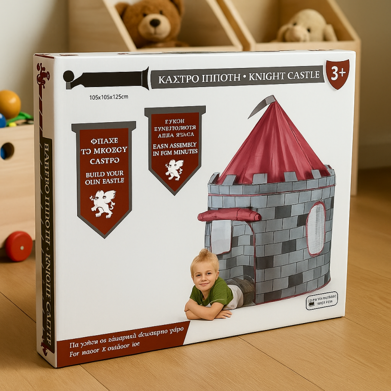 Детска палатка замък - забавление за малки рицари! Лесно сглобяване, подходяща за вътрешна и външна употреба. Идеална за въображаеми игри и приключения.