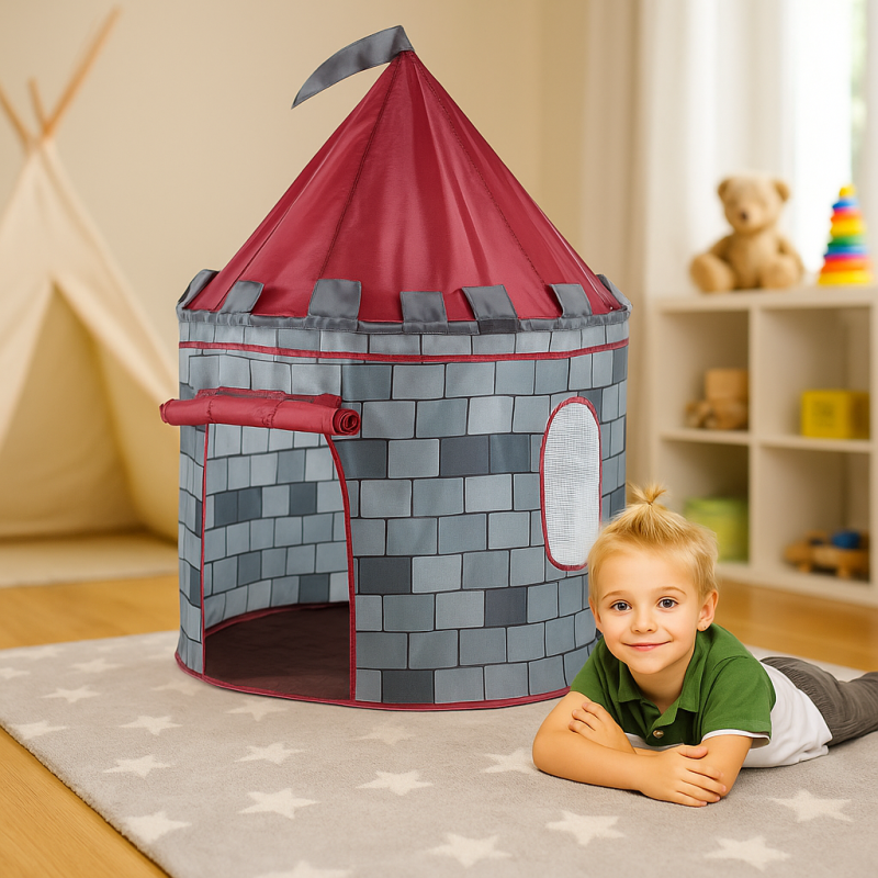 Детската палатка рицарски замък е идеалното място за малчуганите да се потопят в света на рицарите и замъците. С дизайн, който напомня на истински каменен замък, палатката е сива с червени акценти, което я прави подходяща за всяка детска стая. Лесното сглобяване позволява да се монтира за броени минути, предоставяйки на децата незабавно пространство за игра и въображение.