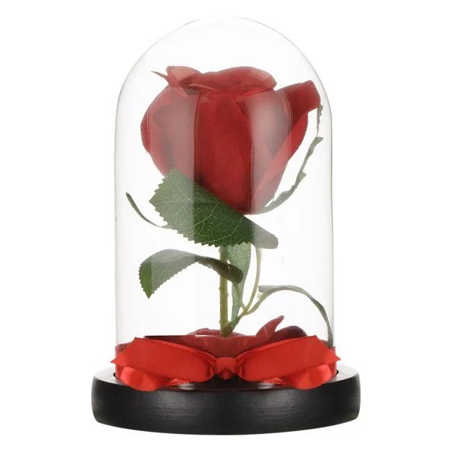Стъкленият купол е изработен от устойчиво стъкло, което предпазва розата и подчертава нейната естетика. Дървената основа придава топлина и стабилност на цялостния дизайн. Това съчетание от материали гарантира дълготрайност и универсалност на продукта.