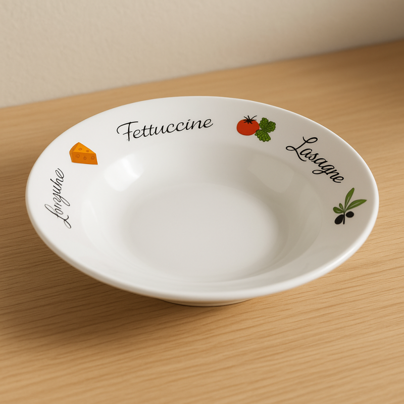 Чинията разполага с широк борд, украсен с красиви щампи на класически италиански съставки като спагети, лазаня, карбонара и помодоро. Този уникален дизайн не само придава стил на вашата трапеза, но и прави храненето още по-приятно.
