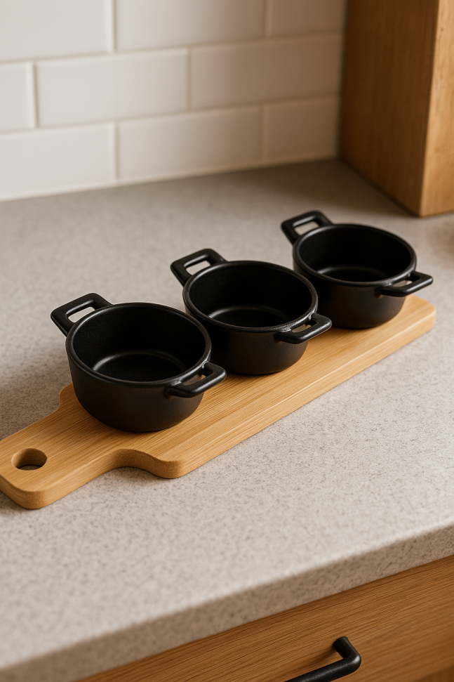 Подносът е изработен от естествен бамбук, който е устойчив и екологично чист материал. Трите керамични купички са с черен матов завършек, а малките им дръжки улесняват захващането и сервирането.