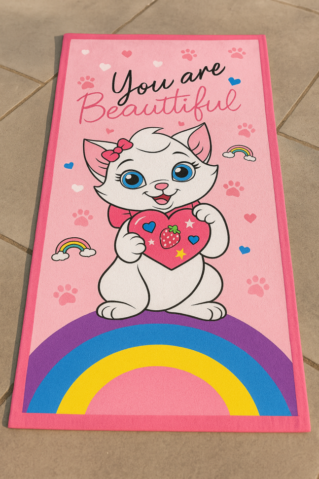 Детска памучна плажна кърпа Мари – розова, мека и с послание „Ти си красива“. Перфектна за момичета, които обичат котенцето Мари и лятното забавление!
