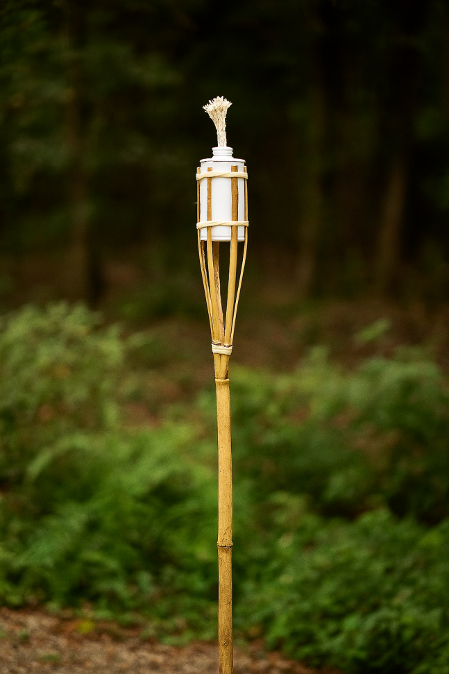 Добавете атмосфера и стил към градината, двора или терасата си с факлата с масло – Бяла – 120 см. Този елегантен бамбуков факел съчетава природна естетика с функционалност, осветявайки вашето външно пространство по един неповторим начин. Подходящ е както за ежедневно ползване, така и за специални поводи като градински партита, барбекюта или романтични вечери на открито.