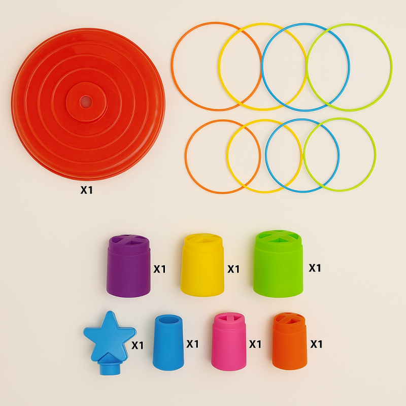 Със своите разнообразни цветове и размери, тази игра насърчава визуалното възприятие, координацията око-ръка и състезателния дух. Всеки ринг е създаден да пасва точно на различна височина на кулата, което прави играта още по-интересна. Материалите са леки и безопасни, подходящи за деца над 3 години. Играта е подходяща за момчета и момичета, като може да се играе както на закрито, така и навън.