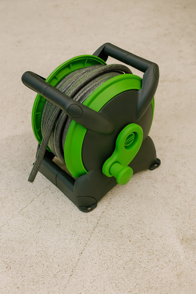 Със своята лека конструкция, макарата може да бъде пренасяна с лекота, без усилия. Ръчното колело позволява бързо и лесно навиване на маркуча, което поддържа пространството чисто и организирано. Отстрани се намира стабилен изход за водоснабдяване, който гарантира сигурна връзка с маркуча.