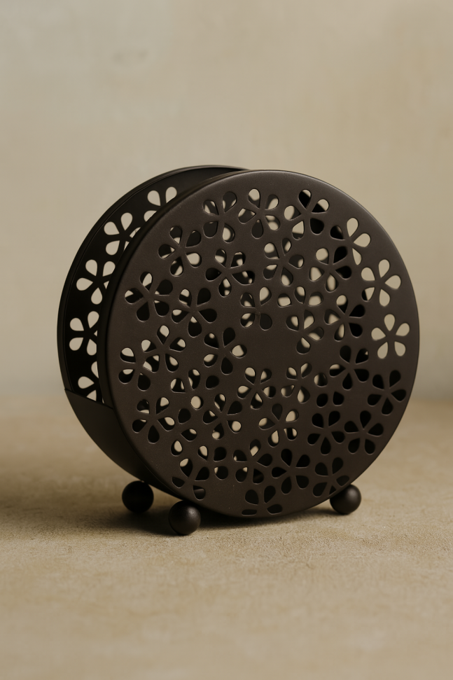 Кръгла метална поставка за спирала против комари с елегантен флорален дизайн в кафяв цвят – стилно и практично решение за дома или градината.