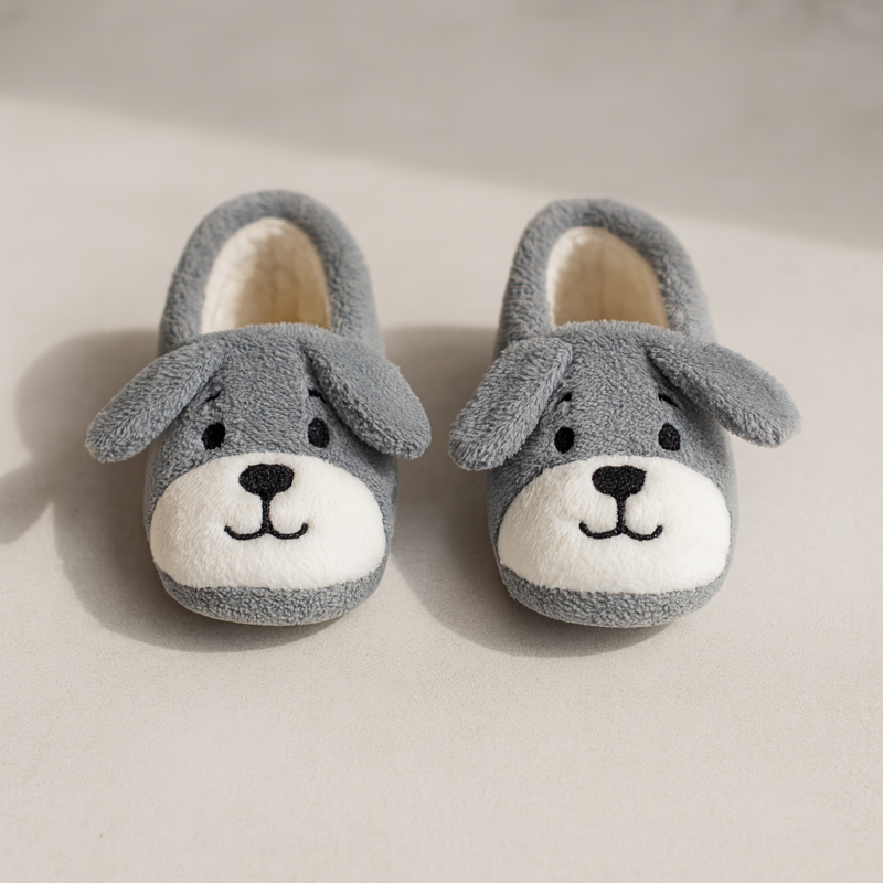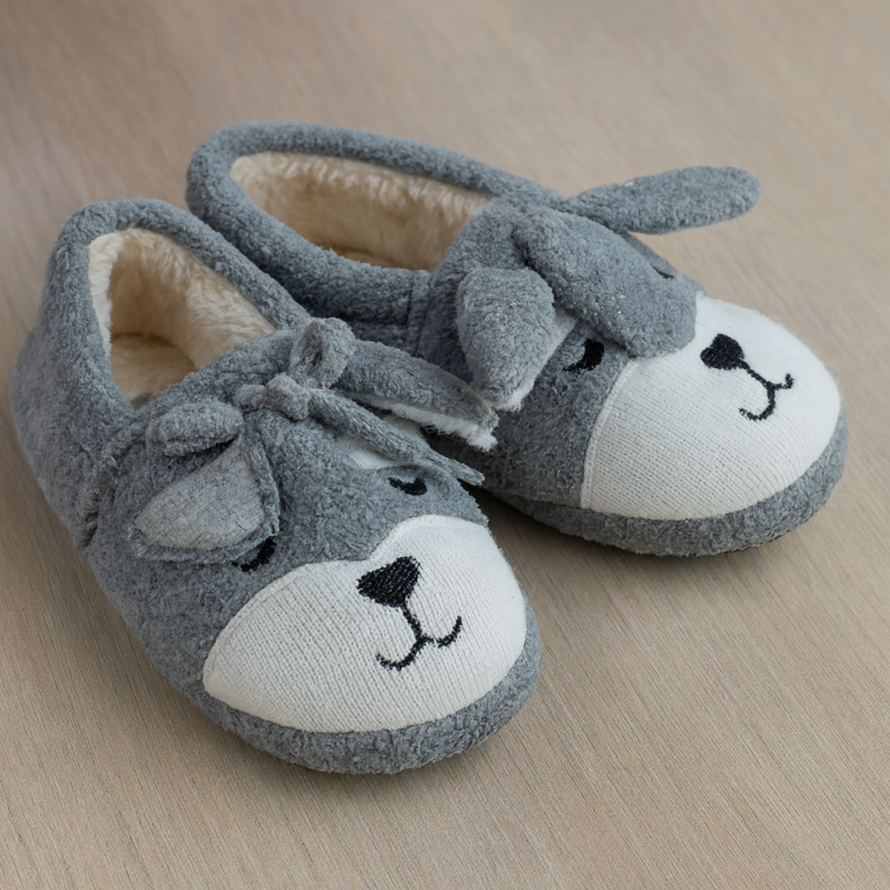 Тези пантофи впечатляват със своя мил и забавен вид – сиво кученце със затворен дизайн, който нежно обгръща крака. Те не само стоплят, но и създават уютна атмосфера, придавайки настроение във всеки зимен ден.