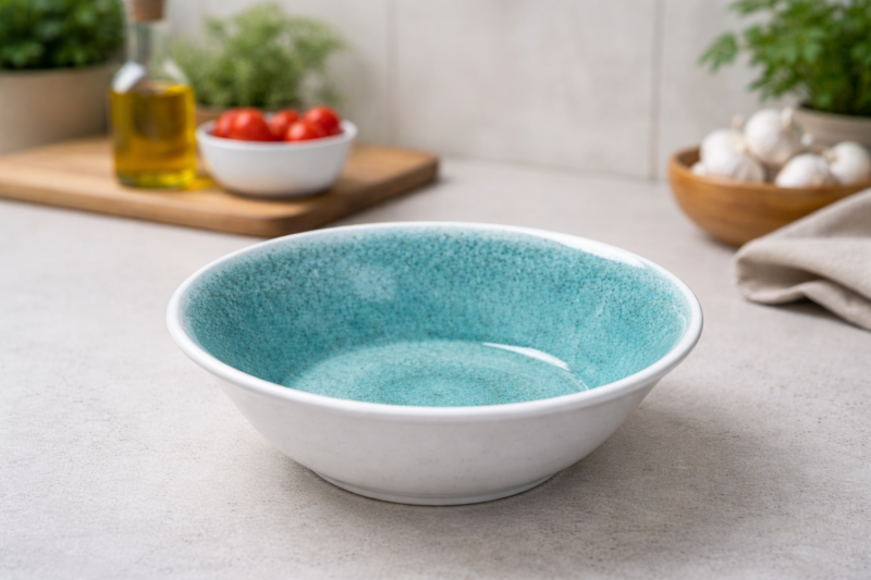 Купа за салата – Меламин – 1.85 л в тюркоазен цвят със scallop дизайн – лека, здрава и стилна, идеална за сервиране на салати и летни ястия.