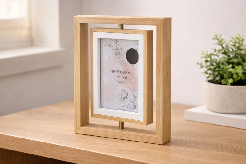 Рамка за снимки от дъб с въртящи елементи – 10 × 15,2 см е стилна декоративна рамка от дърво и стъкло с 3D ефект, идеална за съхранение и показване на любимите ви снимки.