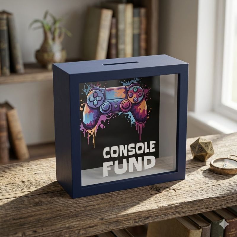 Детска касичка – Конзола – 15,5 x 15,5 см е стилна дървена касичка със стъклена предна част и геймърски дизайн, идеална за насърчаване на спестяването при малките любители на видеоигрите.