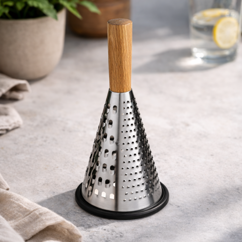 Практичното ренде от неръждаема стомана е незаменим помощник във всяка кухня. Изработено от висококачествена неръждаема стомана, то осигурява дълготрайност, устойчивост на корозия и лесна поддръжка. Елегантната дървена дръжка придава естествен и модерен акцент, като същевременно осигурява удобен и стабилен захват при работа.