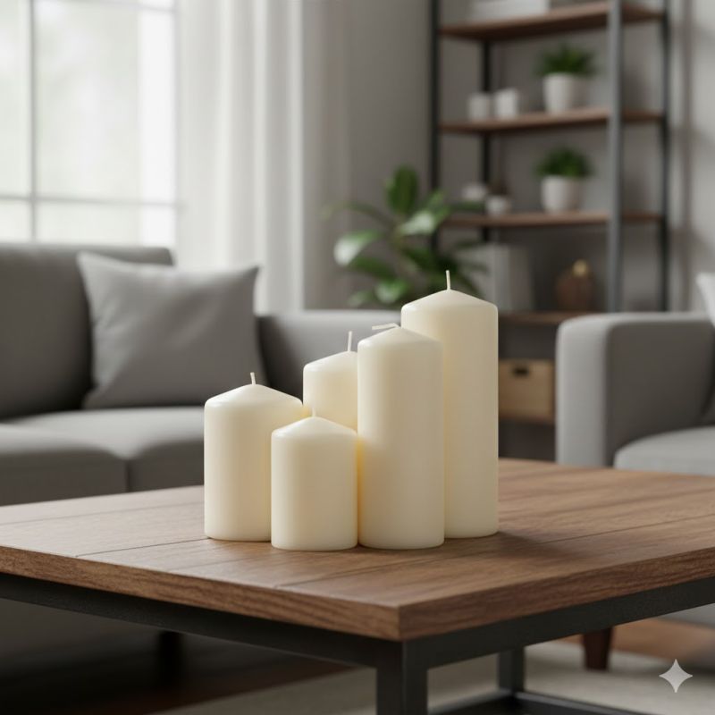 Комплект от пет броя декоративни домакински свещи в цвят слонова кост, изработени от висококачествен парафин.