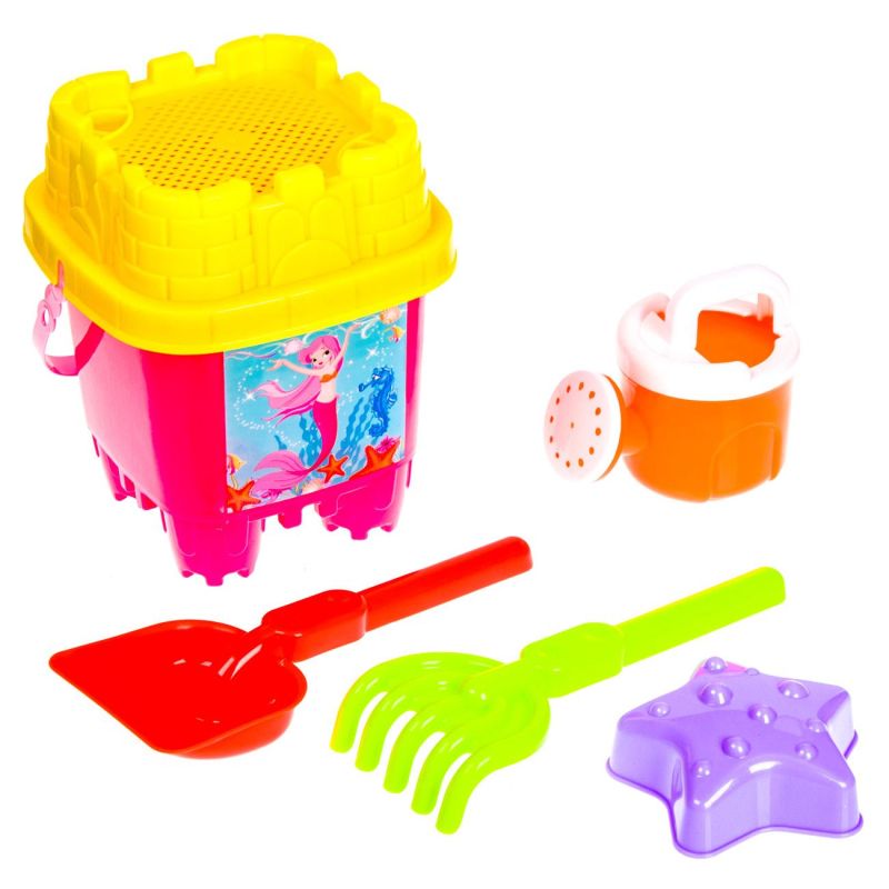 Комплект за пясък - форма за пясък морска звезда, кофичка във формата на замък с капак сито, мини лейка, лопатка, гребло.