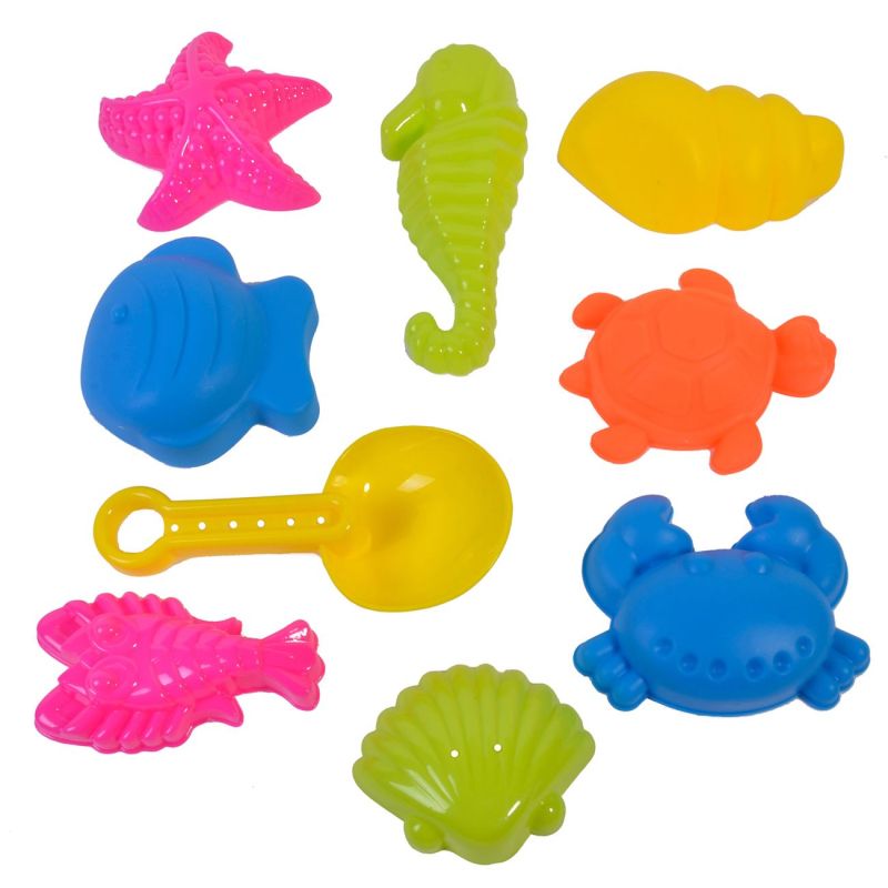Комплект от 8 броя пластмасови форми за пясък в различни цветове - морски обитатели + лопатка.